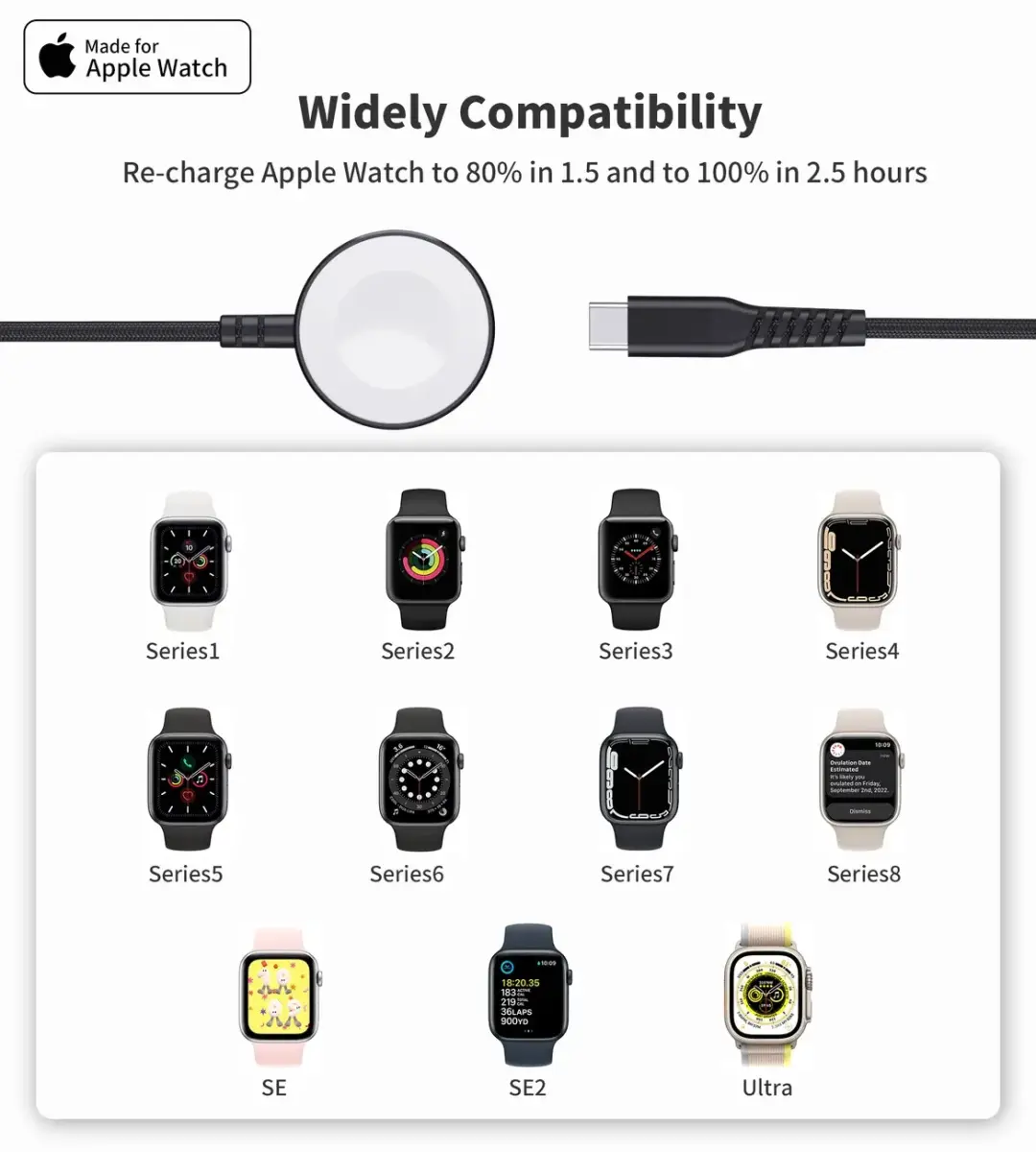 Choetech T319 MFI 5W wireless charger for Apple Watch + USB-C cable - black