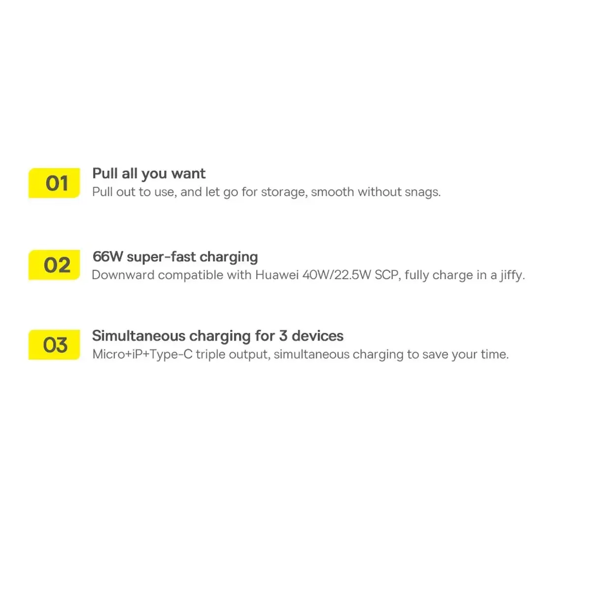 Baseus Bright Mirror 3 3-in-1 datu pārraides un uzlādes vads ir ideāls risinājums, lai ātri uzlādētu un pārraidītu datus starp dažādām ierīcēm. Šis kabelis ir saderīgs ar visām populārākajām ierīcēm, tostarp Apple produktiem, Huawei, Samsung un citiem viedtālruņiem un planšetdatoriem. Ar trīs izejas portiem – USB-C, Lightning un micro USB – jūs varat vienlaikus pieslēgt līdz trīs ierīcēm, kas padara to par lielisku izvēli ceļojumiem vai ikdienas lietošanai. Kompaktais un atsperes mehānisms nodrošina vieglu uzglabāšanu un transportēšanu, savukārt iebūvētais drošības sistēma aizsargā jūsu ierīces no pārkaršanas un bojājumiem. Ar 66W jaudu jūs varat ātri uzlādēt pat jaudīgākos viedtālruņus, piemēram, Huawei Mate 40 Pro, un datu pārraides ātrums līdz 480 Mbps nodrošina ātru un efektīvu informācijas apmaiņu.