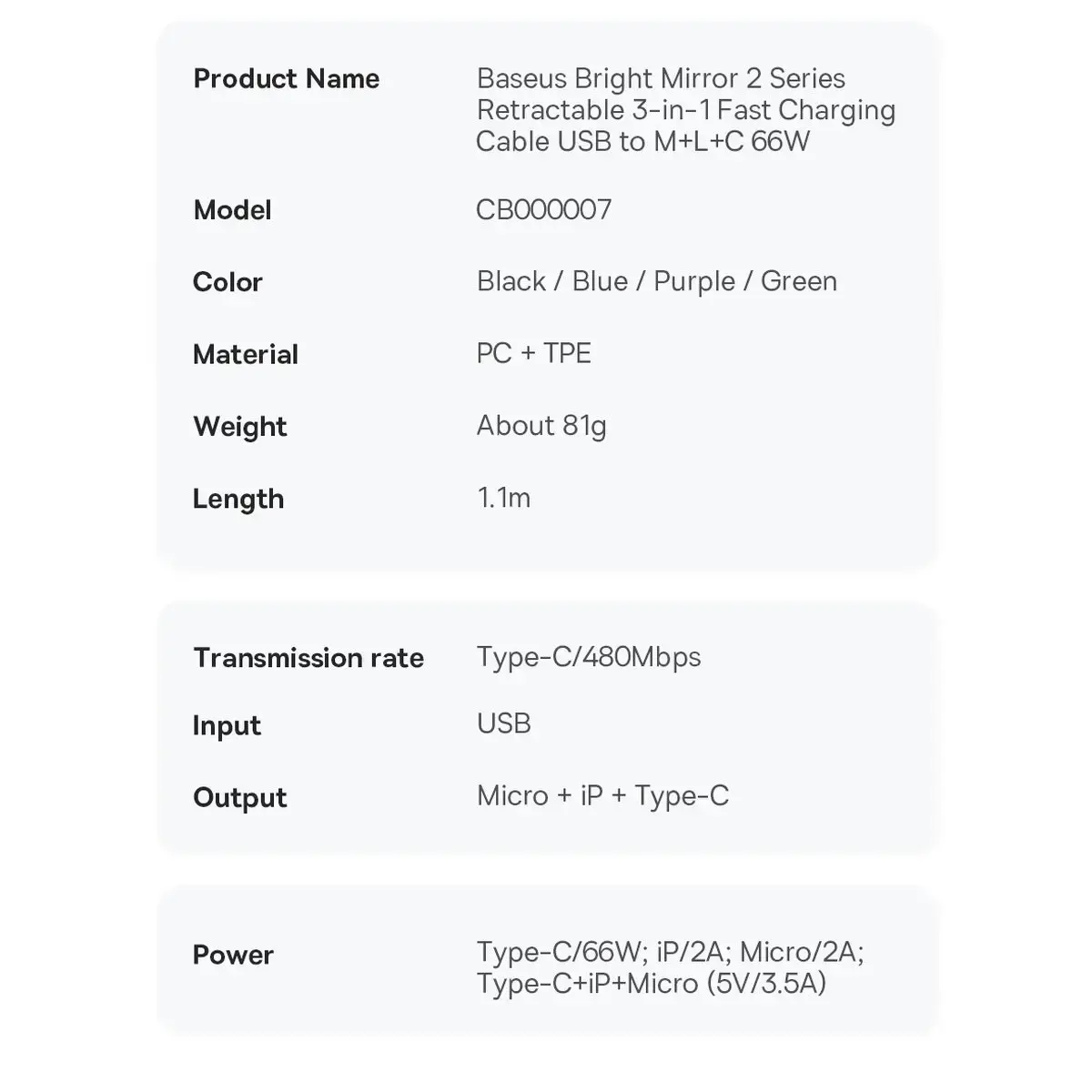 - Jauda: USB-C - 66W, Lightning - 2A, Micro USB - 2A