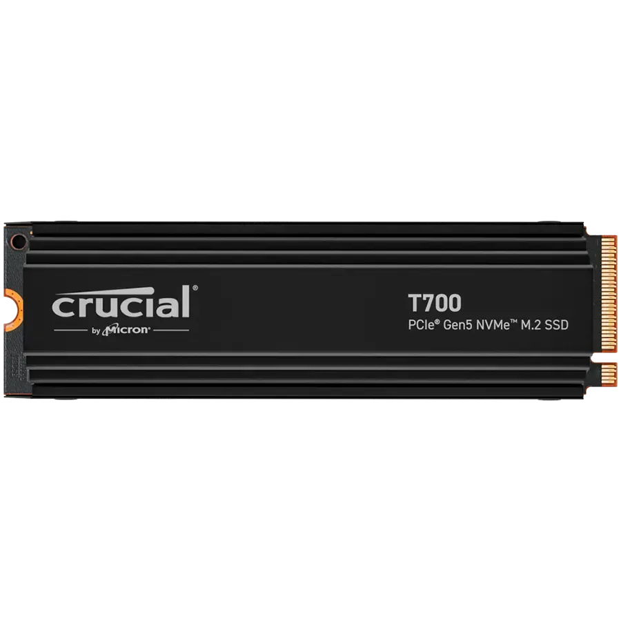 Are you ready to feel the rush of extreme performance? The Crucial T700 PCIe 5.0 NVMe SSD offers speeds of up to 11,700MB/s sequential reads and up to 9,500MB/s sequential writes (up to 1,350K/1400K IOPS random reads/writes) for faster gaming, video editing, 3D rendering and heavy workload applications. Built with Micron 232-layer TLC NAND and featuring a premium aluminum and nickel-plated copper heatsink that dissipates heat without noisy fans or liquid cooling, the Crucial T700 Gen5 SSD is optimized for performance, takes full advantage of Microsoft DirectStorage, and is backward compatible with Gen3 and Gen4 motherboards. A non-heatsink SKU is also available for use with an integrated motherboard heatsink. With SSD speeds nearly 2x faster than Gen4 in your PC, you'll never look back from the Crucial T700!