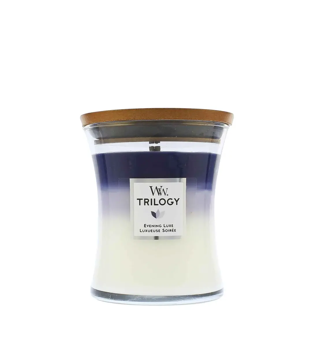 WoodWick Trilogy Evening Luxe scented candle with wooden wick 275 g