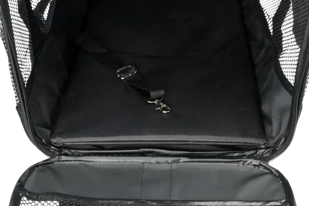 Noņemama regulējama plecu siksna, iekšpusē ­īsa pavada dzī­vnieka fiksācijai.