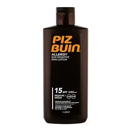 Suncare Piz Buin.Specially developed with dermatologists to protect and soothe sun sensitive skin. The water resistant lotion, absorbs quickly and provides hours of moisturisation and helps prevent your skin from peeling.Combines advanced UVA/UVB sun filters and CALMANELLE, a unique shield complex proven to help strengthen skin's resilience. How to use: Apply generously and evenly before sun exposure. A reduced quantity lowers the protection level significantly. Reapply frequently, especially after sweating, swimming or towelling. Avoid midday sun and staying too long in the sun even while using sunscreen. Keep babies and children out of direct sunlight.Shop Online Piz Buin Allergy Lotion Spf15 200ml at best price. Product features: - Body: SPF Between 15 and 30- Skin Type: Sensitive Skin.