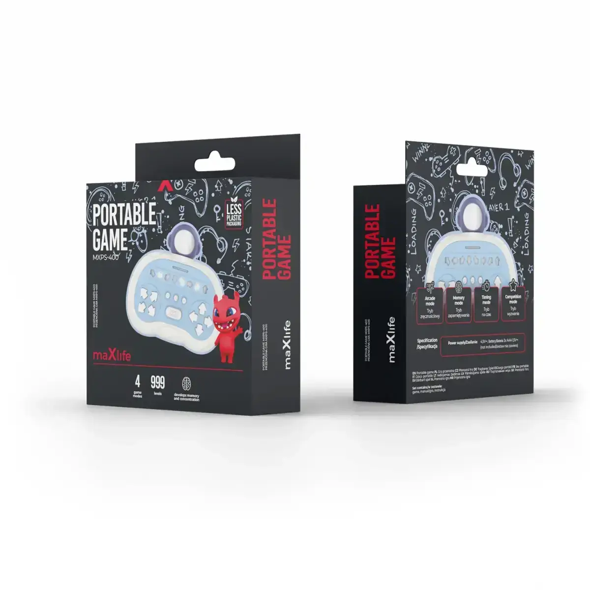 Maxlife MXPS-400 is a compact arcade game designed for active and developmental play. The device enhances reflexes, concentration, and hand–eye coordination through dynamic gameplay in four modes with varying levels of difficulty. Its portable design allows you to use the game anywhere – at home, on the go, or during a break at school. A cute bunny design.
