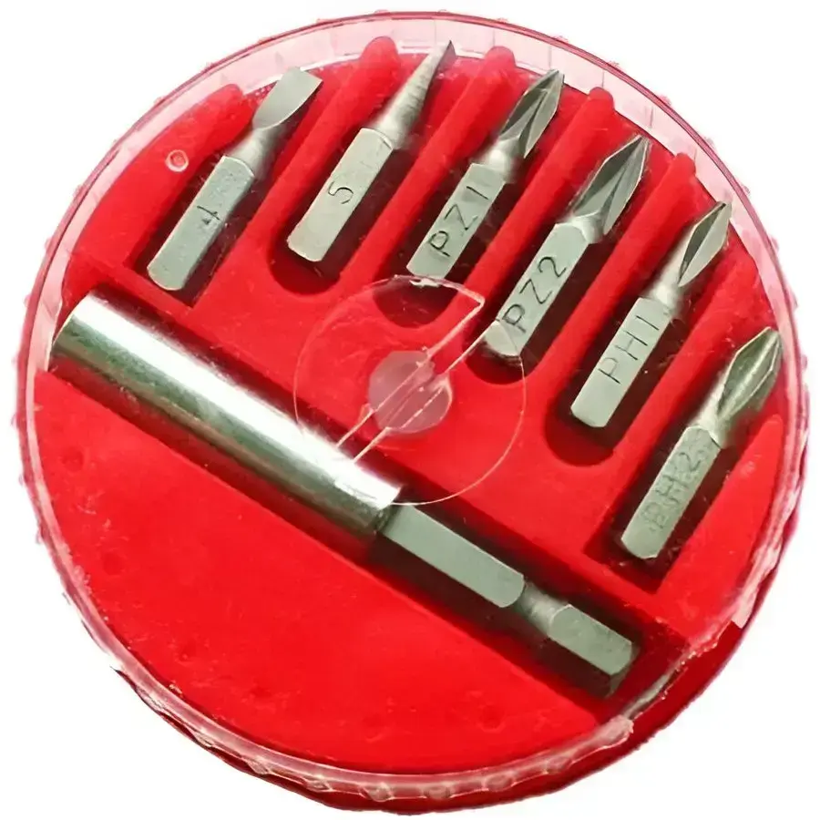 Komplektā ietilpst adapteris un 6 magnētiski skrūvgrieža uzgaļi - plakanie 5 mm un 6 mm, PZ1, PZ2, PH1, PH2. Izgatavoti no izturīga tērauda.