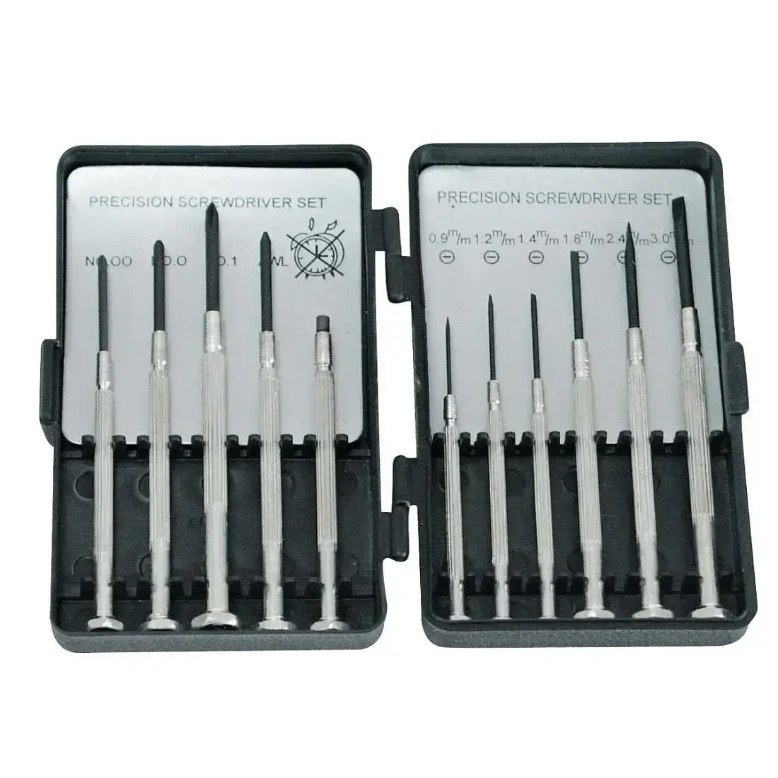 Precīzijas skrūvgriežu komplekts pulksteņmeistariem un elektronikas inženieriem. Metāla, robains rokturis ar rotējošo galu nodrošina drošu un ērtu instrumenta manevrēšanu dažādos leņķos.