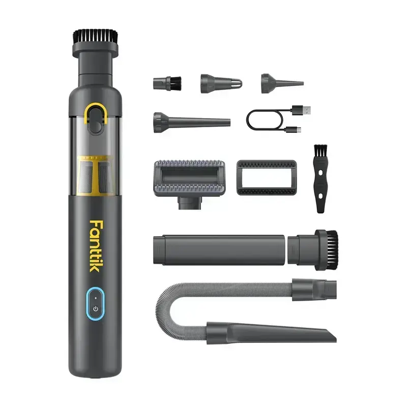 The Fanttik Slim V8 Apex is a compact cordless car vacuum cleaner with a maximum suction power of 19,000 Pa, equipped with 10 interchangeable cleaning tips. It is an improved version of the Slim V8 Mate model, offering more power (19 kPa vs. 12 kPa) and additional blower, pump and suction functions.