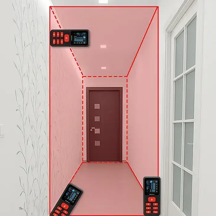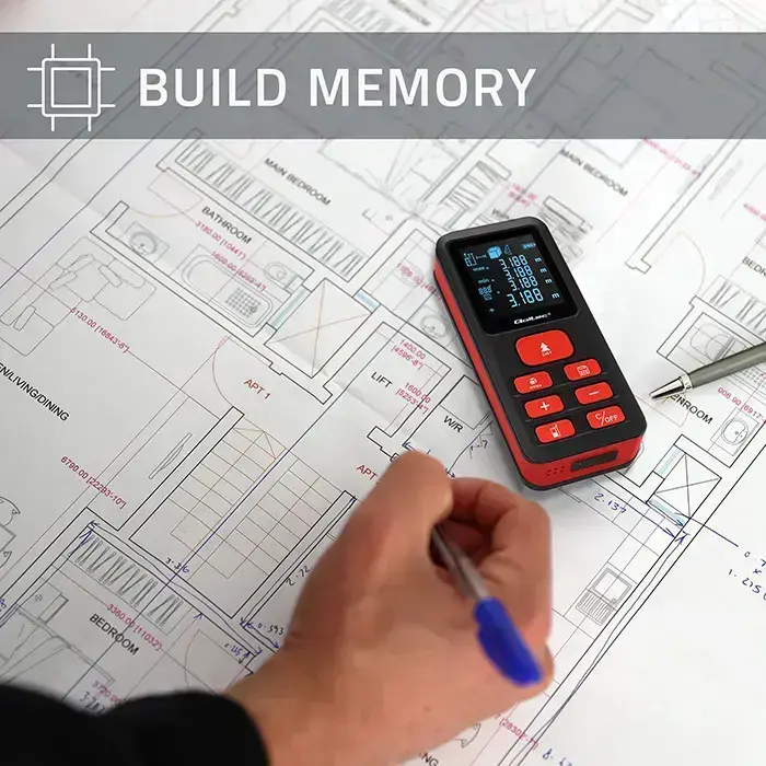 Precision laser meter with distance, area, volume, max/min and Pythagorean measurement functions. The built-in electronic spirit level allows for quick and accurate checking of the slope in degrees.