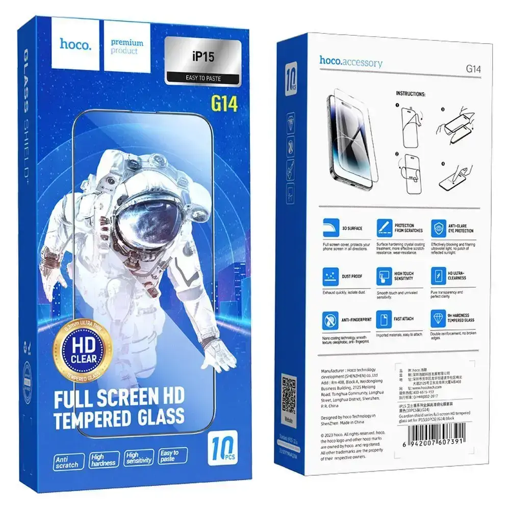 Tempered glass to iPhone 15 / 16 Hoco HD 5D Guardian shield 10 pcs G14 black