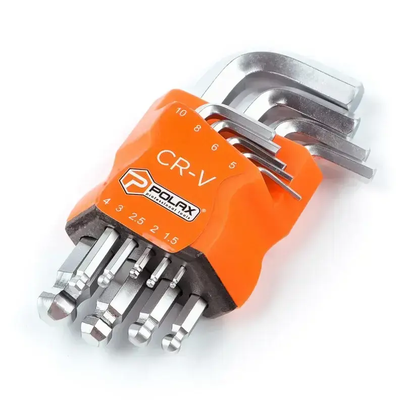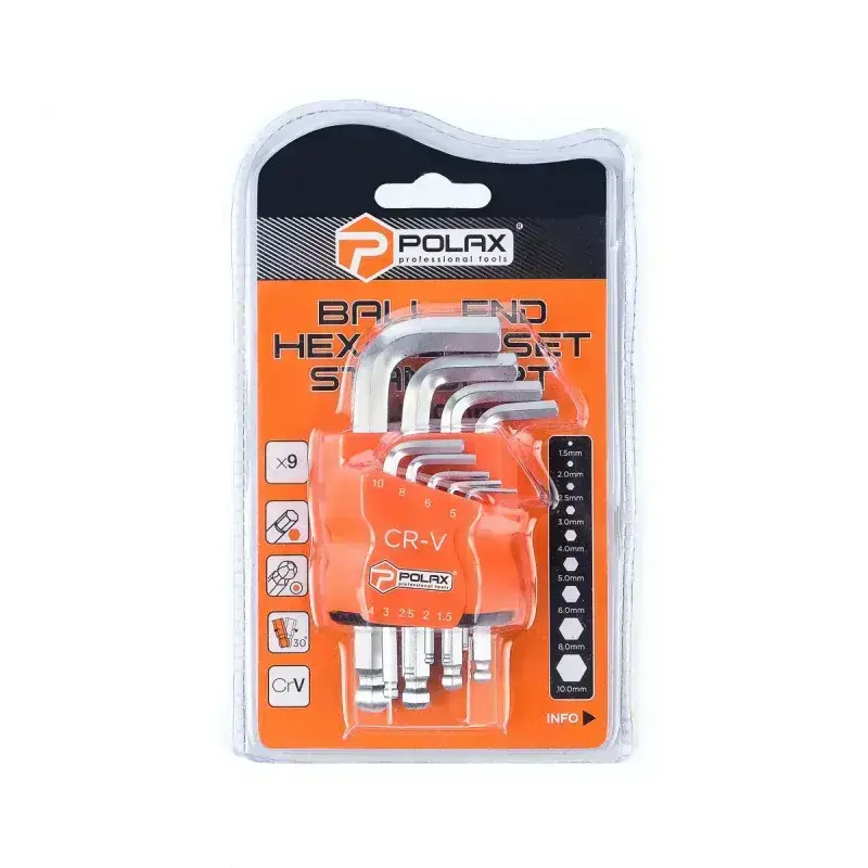 Plax sešstūra atslēgu komplekts ar lodveida galviņām (25-009) ir universāls un ērts instruments, kas ir ideāli piemērots dažādiem uzdevumiem, strādājot ar skrūvēm, kas aprīkotas ar iekšējo sešstūra uzmavu. Šajā komplektā ir 9 dažādu izmēru atslēgas, sākot no 1,5 mm līdz 10 mm. Katra komplektā iekļautā atslēga ir izgatavota no augstas kvalitātes Cr-V tērauda, kas nodrošina izturību un ilgu kalpošanas laiku. Šo atslēgu unikālā īpašība ir vienā pusē izvietotās lodveida galviņas, kas ļauj strādāt leņķī līdz 30 grādiem, padarot tās ērtas, piekļūstot grūti aizsniedzamām vietām. Atslēgu garums ir no 45 mm līdz 112 mm, kas nodrošina to ērtumu un daudzpusību. Komplektam ir ērts plastmasas iepakojums ar nodalījumiem katrai atslēgai, kas atvieglo to uzglabāšanu un organizēšanu. Polax sešstūra atslēgu komplekts ar lodveida galviņām (25-009) ir neaizstājams remonta, montāžas un apkopes darbarīks. Neatkarīgi no tā, vai strādājat automobiļu, celtniecības vai sadzīves tehnikas nozarē, šis kompaktais un ērtais komplekts nodrošina precīzu un uzticamu darbību ar stiprinājumiem, padarot jūsu darbu efektīvāku.