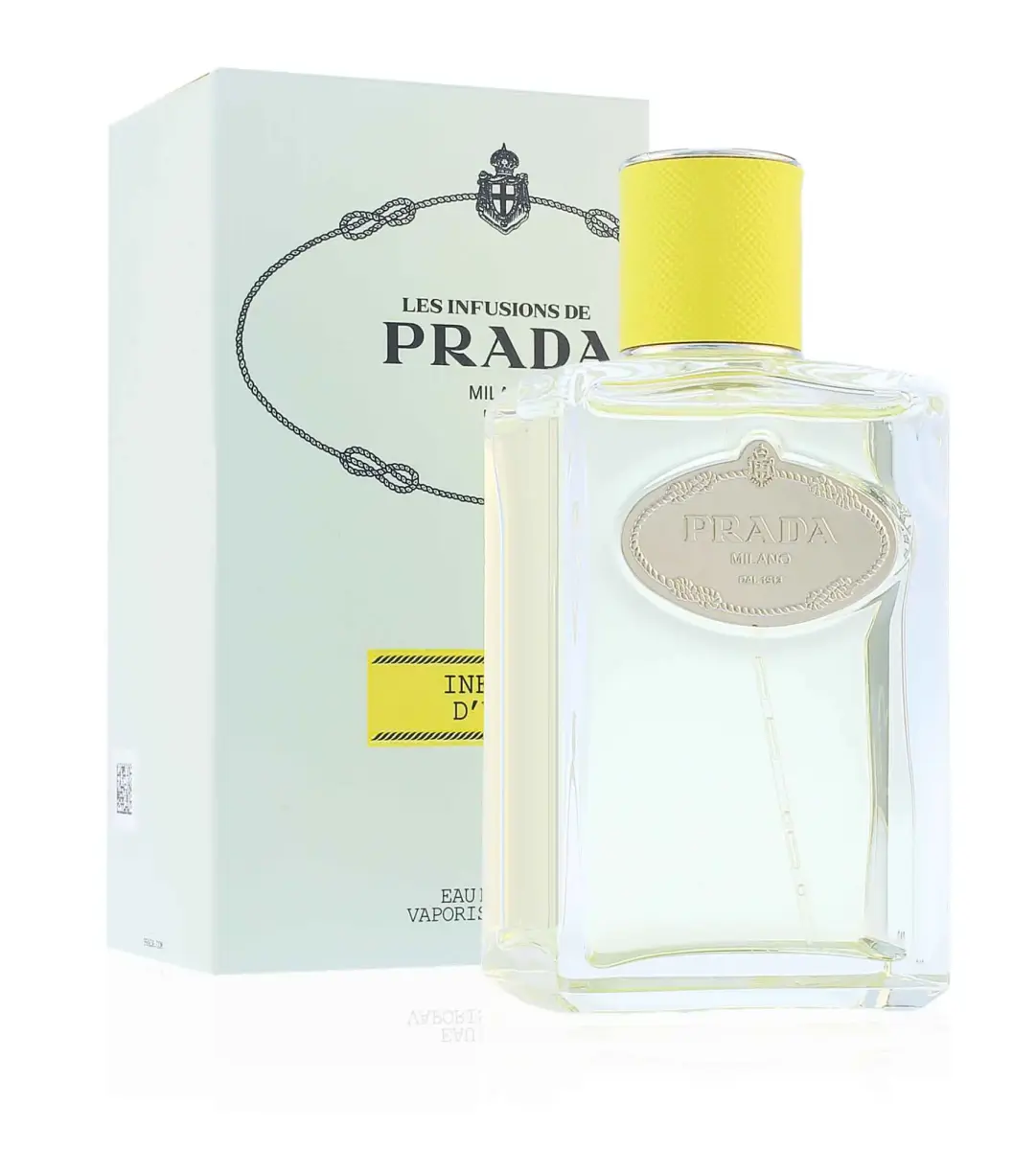 Solar and fresh Prada Infusion d'Ylang Eau de Parfum from the Les Infusions collection reveals captivating floral notes of ylang mixed with bergamot and spicy cardamom, complemented by a base note of sandalwood. The luxurious bottle embodies the essence of the Prada brand: vintage and sophistication with a touch of fantasy. The transparent yellow tinted shade of the bottle evokes the fusion of the characteristic component of the fragrance. Wrapped in the iconic saffiano leather in bright yellow, the cap symbolizes ylang and the radiance of the fragrance.