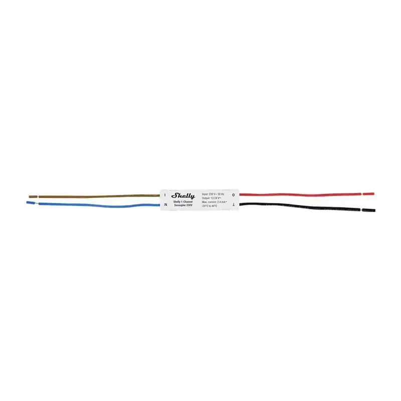 ManufacturerShellyModelChannel Decoupler 230VChannels1ApplicationTriggering DC inputs with an AC signal, isolating circuits, upgrading installationsCompatibilityShelly Plus RGBW PM, Shelly Pro RGBWW PM, Shelly Plus Uni, Shelly Plus Add-On.Inputs2 wires: L, N (AC 230 V)Outputs2 wires: 4- (GND), 4+ (DC signal)Input voltage230 V~ 50 HzMax. output current2.4 mAPower consumption< 0,6 WOperating temperature range0°C - 40°CStorage temperature-20°C - 40°COperating humidity30 - 70% RHMax. working altitude2000 m above sea levelDimensions48 × 13 × 7 mmWeight14 gCase colorWhiteCable length80 mmWire colorsBrown (L), Blue (N), Red (O), Black (⊥)