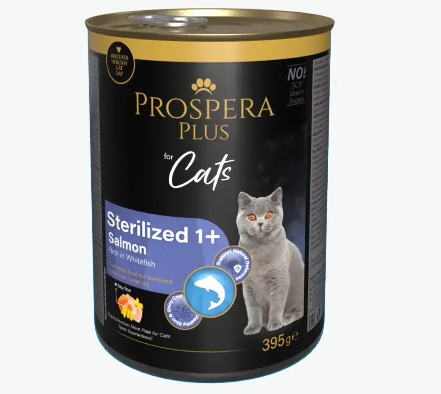 Kaķu konservi – Prospera Plus Cat, Meat Paté Sterilized 1+, Salmon with Whitefish, 395 g