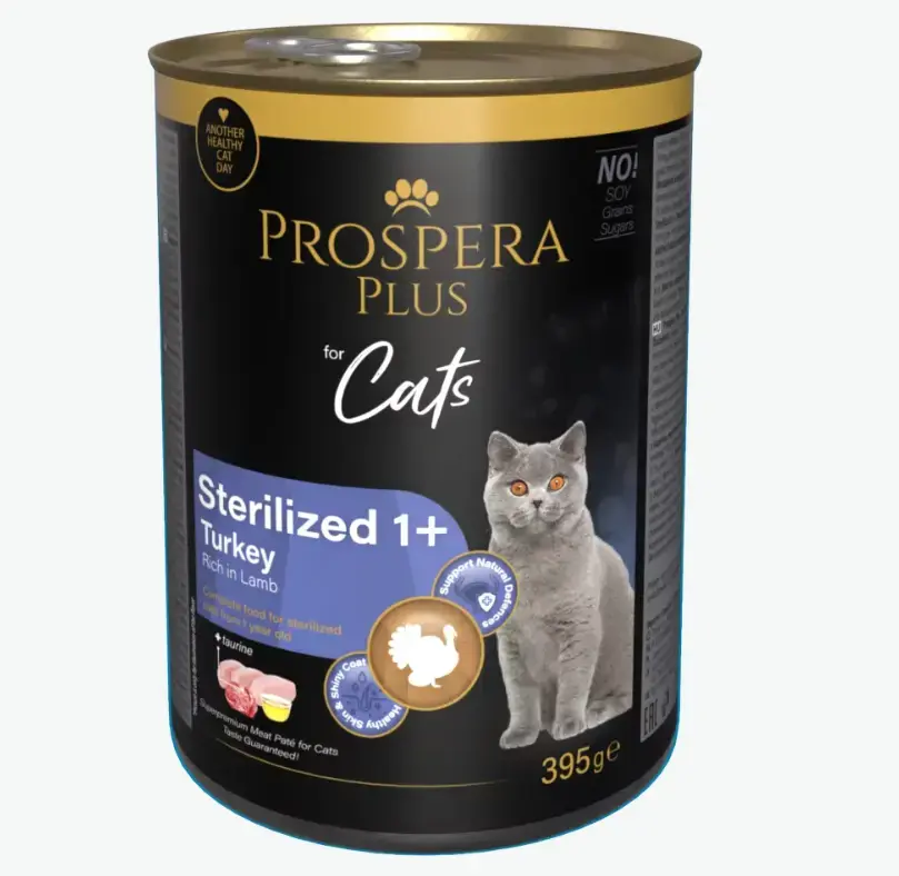 Konservi kaķiem – Prospera Plus Cat Meat Paté Sterilized 1+, Turkey with Lamb, 395 g