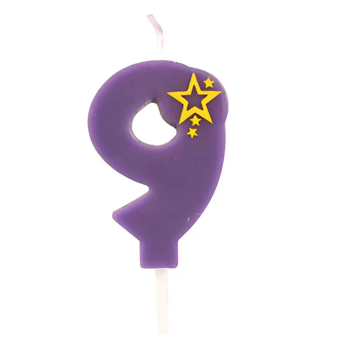 Violeta dzimšanas dienas svecīte 9. Izgatavota no parafīna. Svecītes augstums ar kātu 6.8 cm, bez kāta 4.5 cm. Degšanas ilgums aptuveni 6 minūtes.