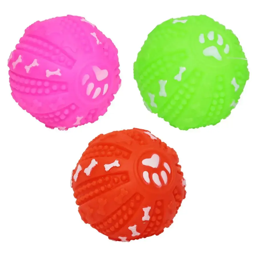 Rotaļlieta gumijas bumbiņa ir izturīga un rotaļīga suņu rotaļlieta, kas paredzēta aktīvām spēlēm gan telpās, gan ārā. Teksturētā virsma ar reljefiem kauliņiem un ķepu motīviem palīdz piesaistīt suņa uzmanību un apmierina dabisko košļāšanas instinktu. Bumbiņa labi ripo un atlec, veicinot kustību un fizisko slodzi, kas īpaši noder enerģiskiem mājdzīvniekiem. Izturīgais gumijas materiāls nodrošina ilgmūžību un drošu izmantošanu ikdienas rotaļās. Diametrs 6.7 cm.