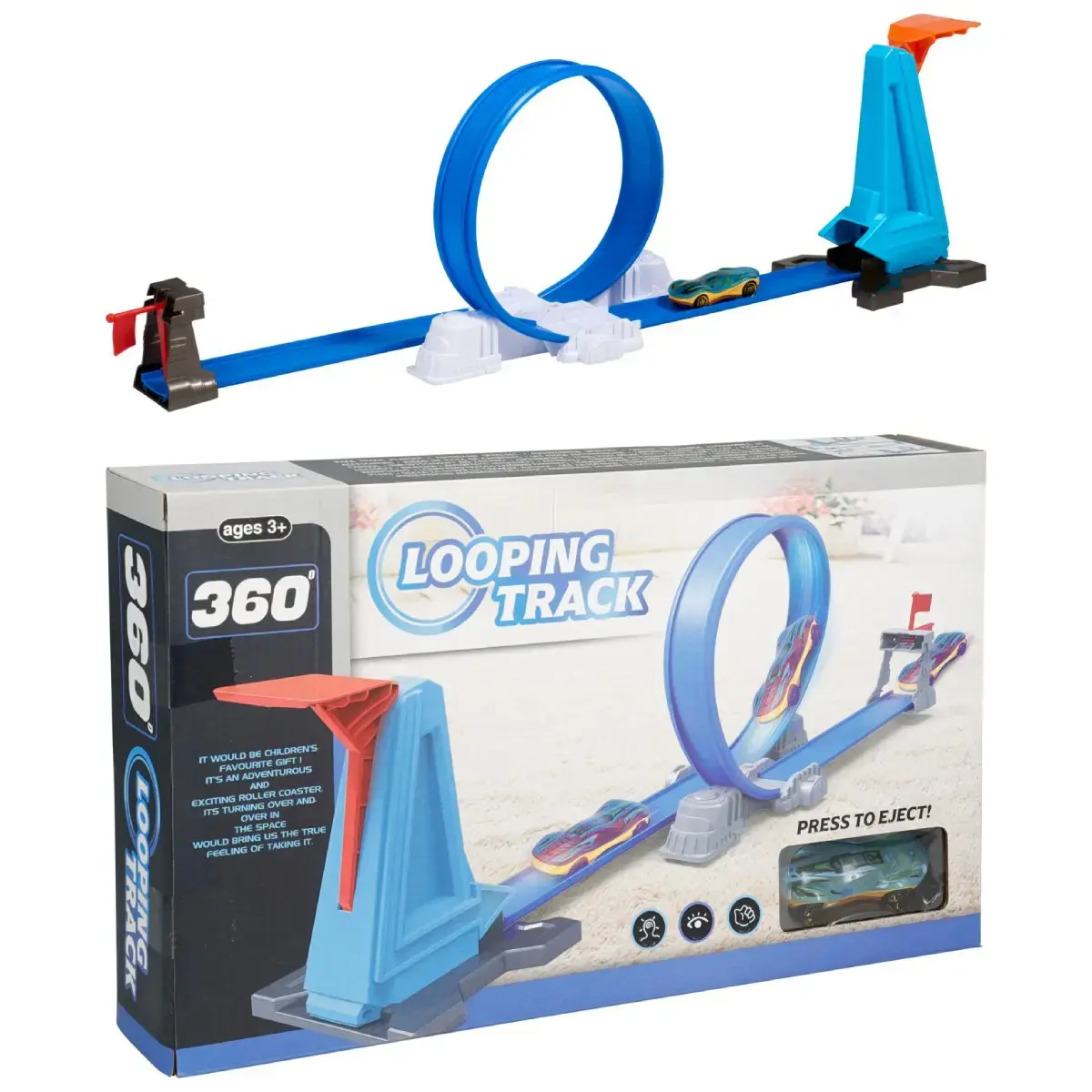 Sacīkšu trases komplekts ir aizraujoša spēle bērniem, kas iemīļojuši ātrumu un dinamiskas rotaļas. Komplektā ietilpst trase ar starta palaišanas mehānismu, cilpu un rampu, kas ļauj mašīnītei veikt iespaidīgu 360 grādu apgriezienu. Ar vienu pogas spiedienu automašīna tiek palaista pa trasi, radot īstu sacensību sajūtu. Spilgtais dizains un viegli saliekamās detaļas padara šo komplektu par lielisku izvēli aktīvai un iztēli rosinošai spēlei mājās. Piemērots bērniem no 3 gadu vecuma, izgatavots no kvalitatīvas un drošas plastmasas.
