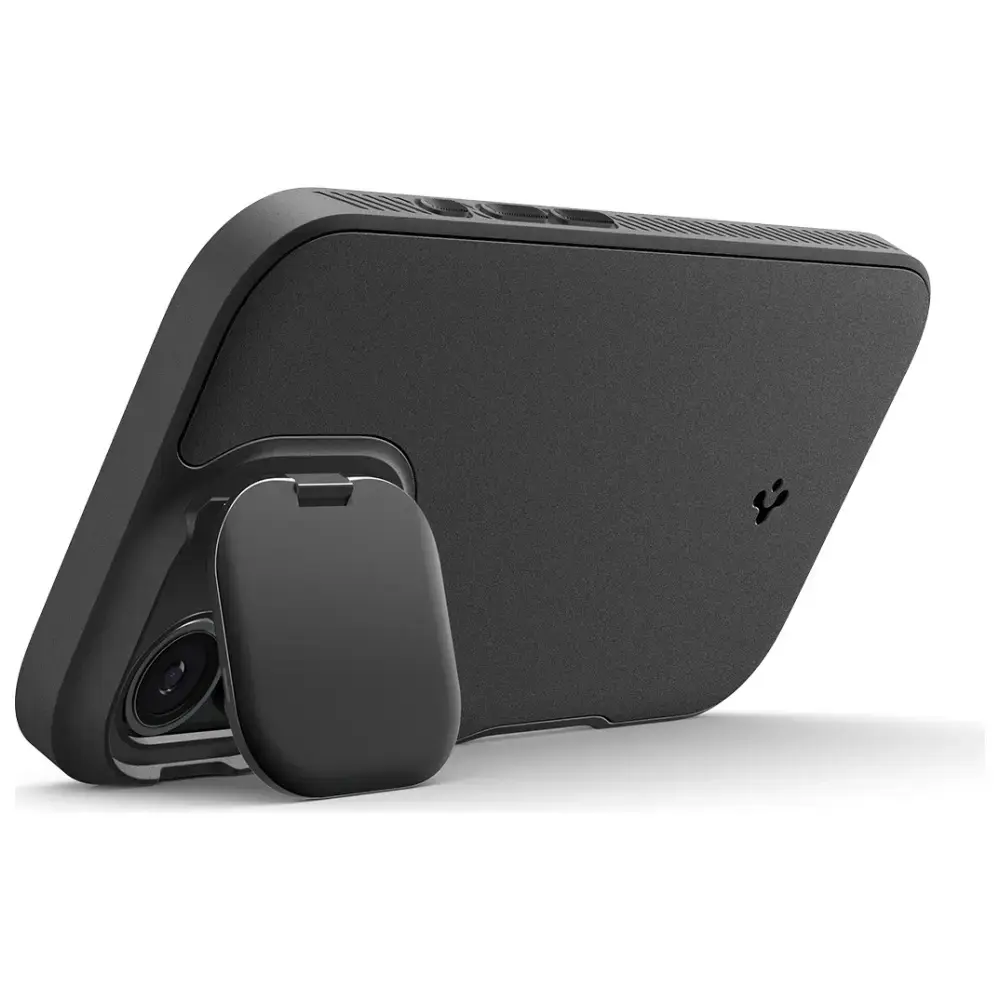 The Spigen Optik Armor MagSafe case combines dual protection with practical camera lens security. The outer layer is made of durable TPU (thermoplastic polyurethane), which absorbs shocks and protects against impacts, while the harder sliding camera cover made of polycarbonate shields the lenses from scratches and dust.