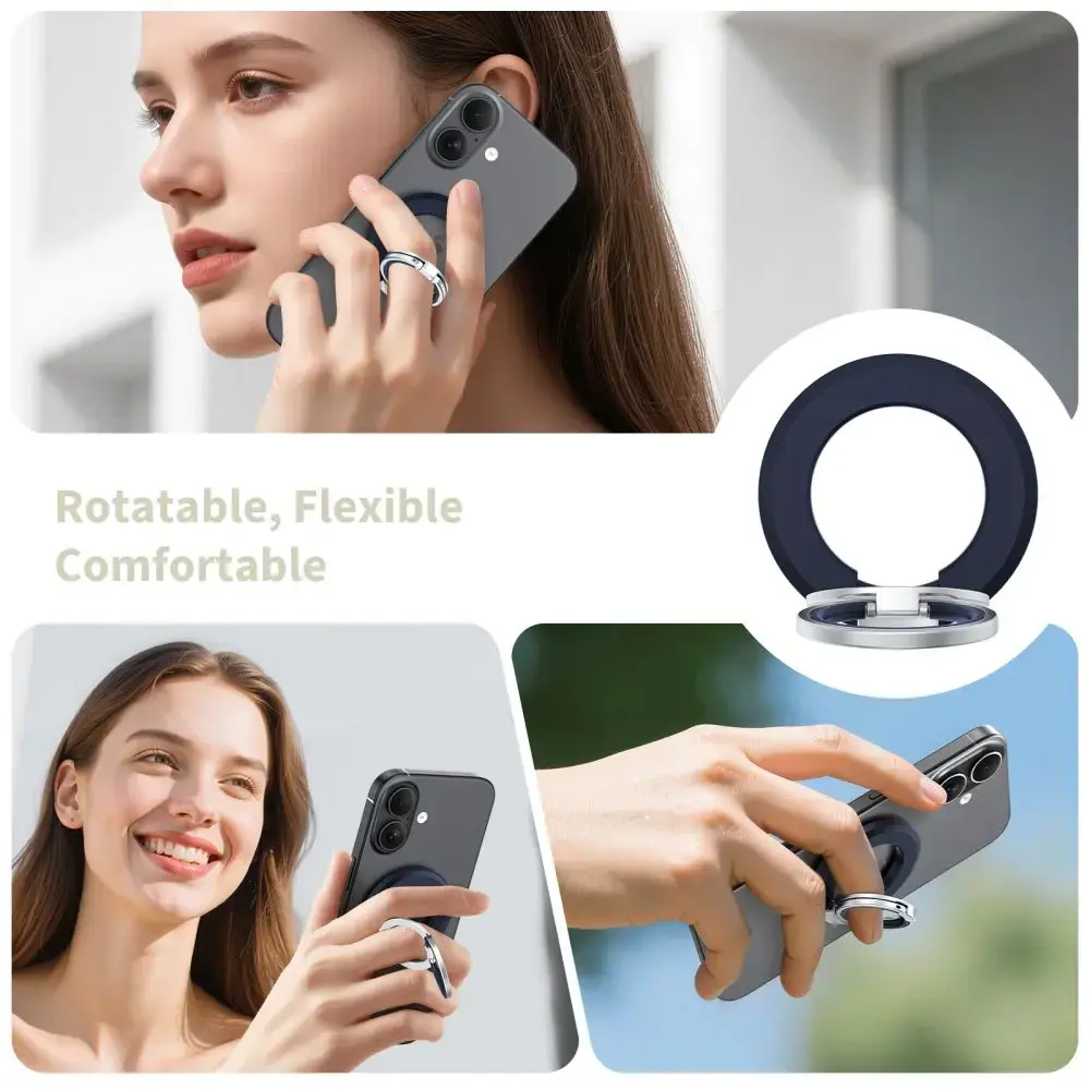 The holder's design allows for smooth adjustment of the tilt angle from 0 to 180 degrees, making it easy to adjust the phone's position while watching movies, working, or video chatting. The central ring tilts up to 90 degrees, allowing the phone to be placed stably on a flat surface or held more comfortably in the hand.