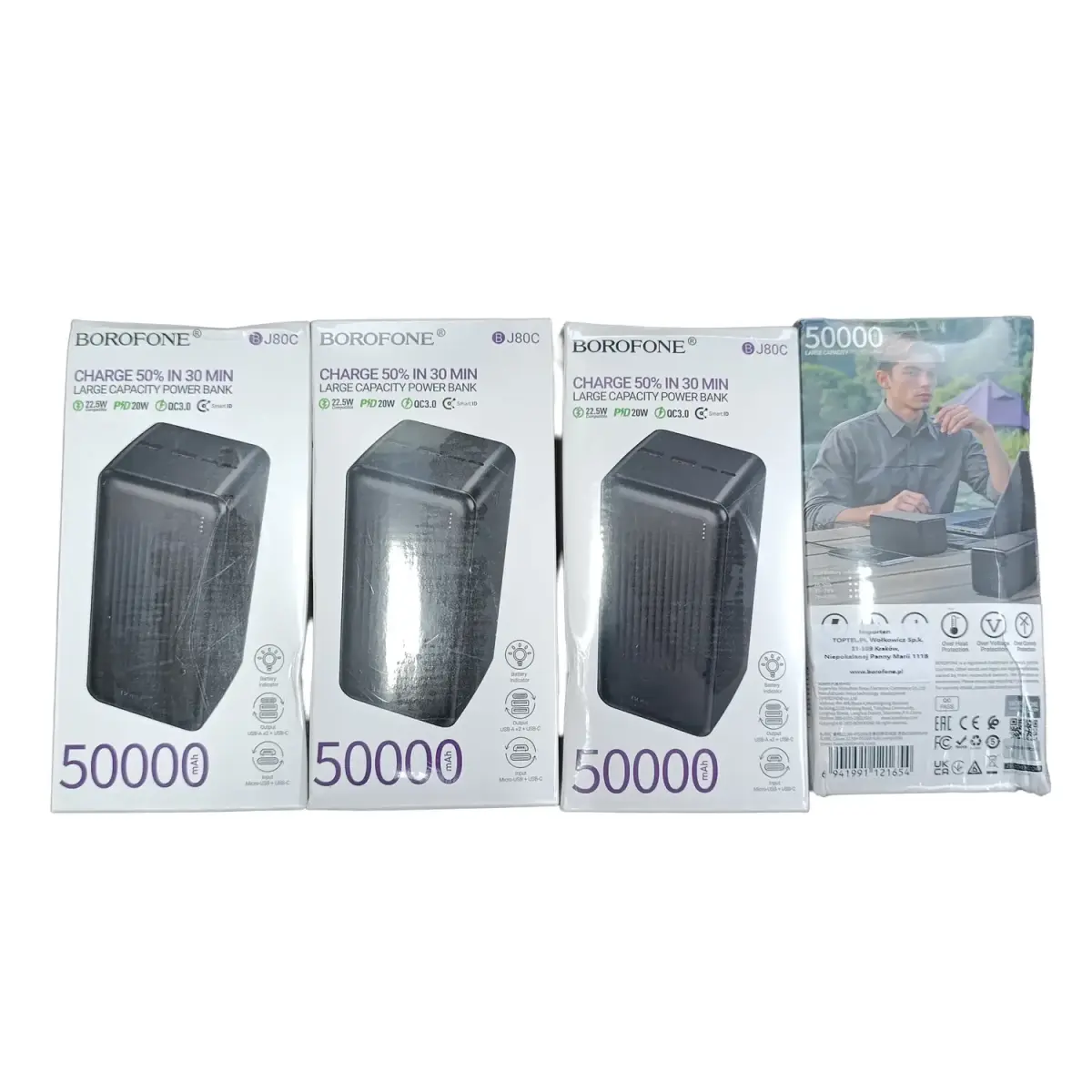 Borofone Power Bank BJ80C Clever 50000mAh – 2×USB + Type-C – QC 3.0 22.5W PD 20W – black is a powerful and versatile portable battery that provides reliable power for multiple devices simultaneously. Built with lithium-polymer cells and an ABS+PC casing, it combines massive capacity with advanced fast-charging technologies.