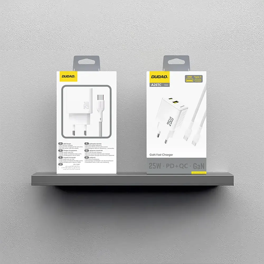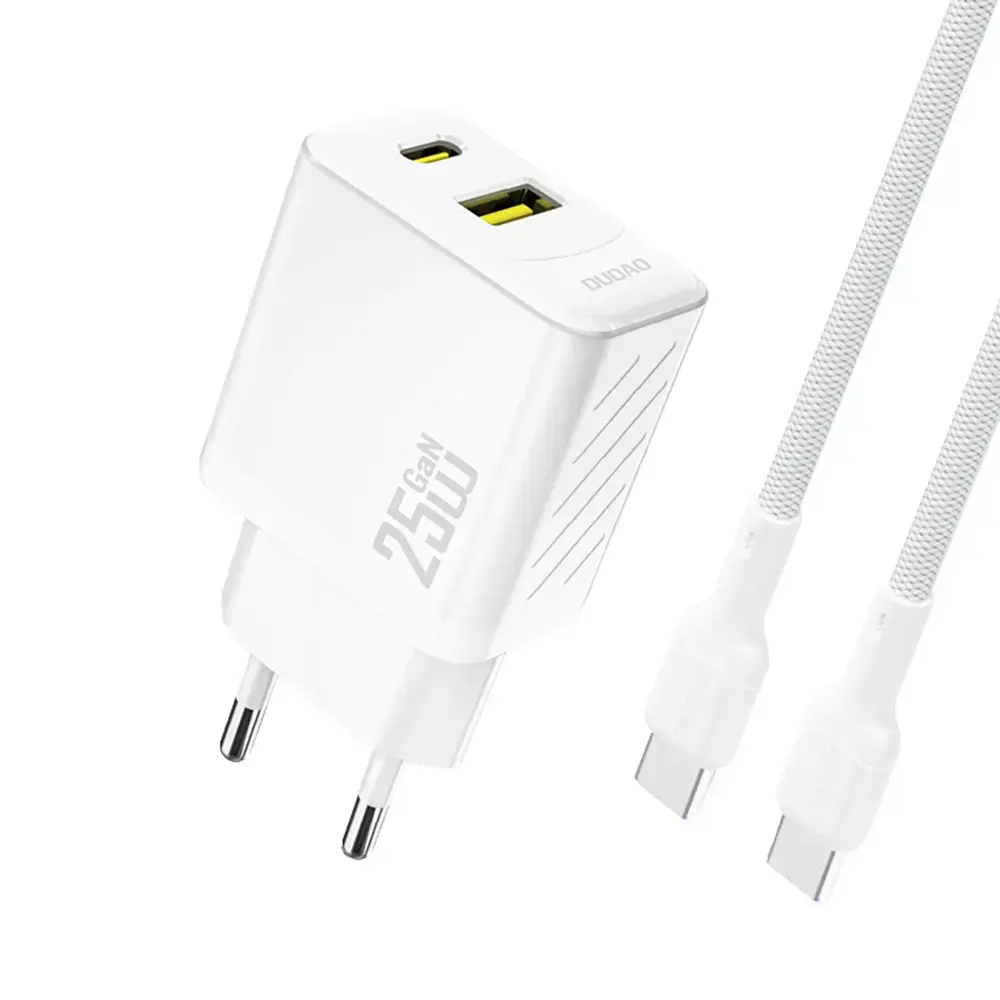 The Dudao A26TCEU wall charger is a modern and functional solution for fast charging mobile devices at home, in the office, and on the go. GaN technology combined with up to 25W of power ensures high efficiency in a compact size. Two ports â USB-C and USB-A â allow you to charge two devices simultaneously, while Power Delivery and Quick Charge support shorten charging times. The non-slip texture of the housing increases comfort and safety of use. The set includes a USB-C to USB-C cable, so the charger is ready to use right out of the box.