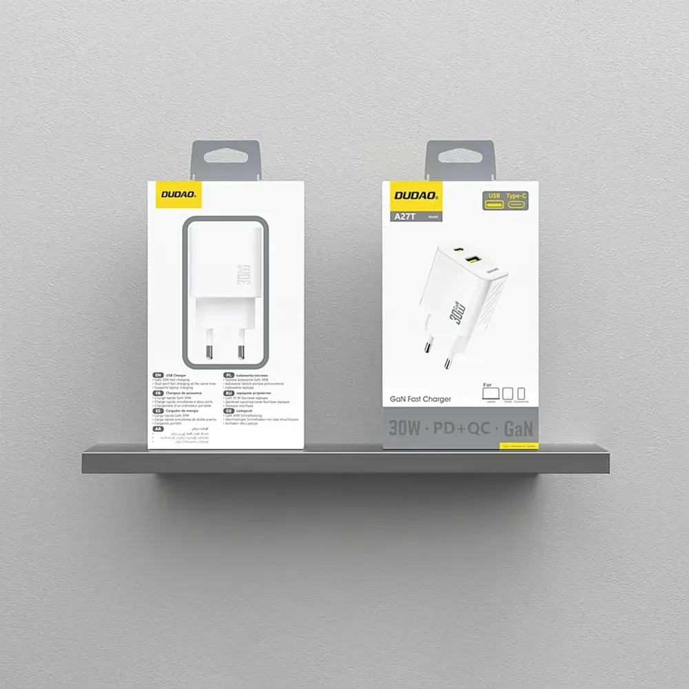 The Dudao A27TEU wall charger is a compact and efficient solution for everyday charging of mobile devices. GaN technology combined with up to 30W of power allows for fast and stable charging while maintaining a compact design. Two ports â USB-C and USB-A â allow for simultaneous charging of two devices without sacrificing performance. An integrated safety system supports safe use, protecting devices from overheating and overload. It's a practical choice for home, office, and travel.