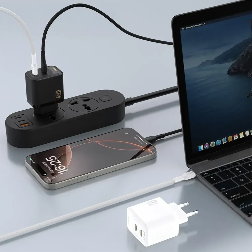 The Dudao A28PEU wall charger is an efficient and modern solution for fast charging of modern mobile and office devices. Power up to 45W combined with GaN technology ensures high efficiency and stable operation in a compact design. Two USB-C ports allow for simultaneous charging of two devices without performance loss. Power Delivery support intelligently adjusts charging parameters to the connected device. It's a practical choice for home, office, and travel.