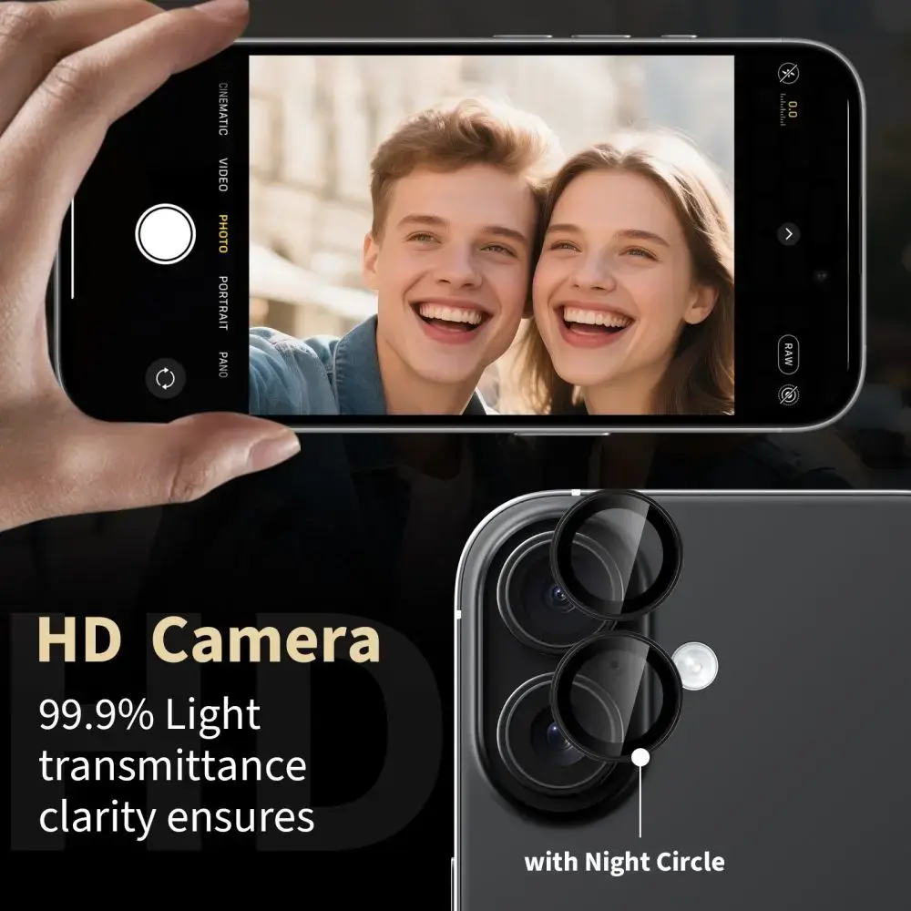 Aluminiowa ramka otacza moduł aparatu, tworząc pierwszą linię obrony przed uderzeniami i kontaktem z powierzchniami. Hartowane szkło pokrywa każdy obiektyw osobno, chroniąc go przed zarysowaniami od kluczy, piasku i innych ostrych przedmiotów. Konstrukcja jest na tyle precyzyjna, że nie wpływa na autofokus, balans bieli ani jakość rejestrowanych materiałów. Czarna kolorystyka idealnie komponuje się z większością etui i dodaje telefonowi premium charakteru.