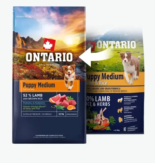 Barība kucēniem – Ontario Puppy Medium, Lamb and Brown Rice, 6,5 kg