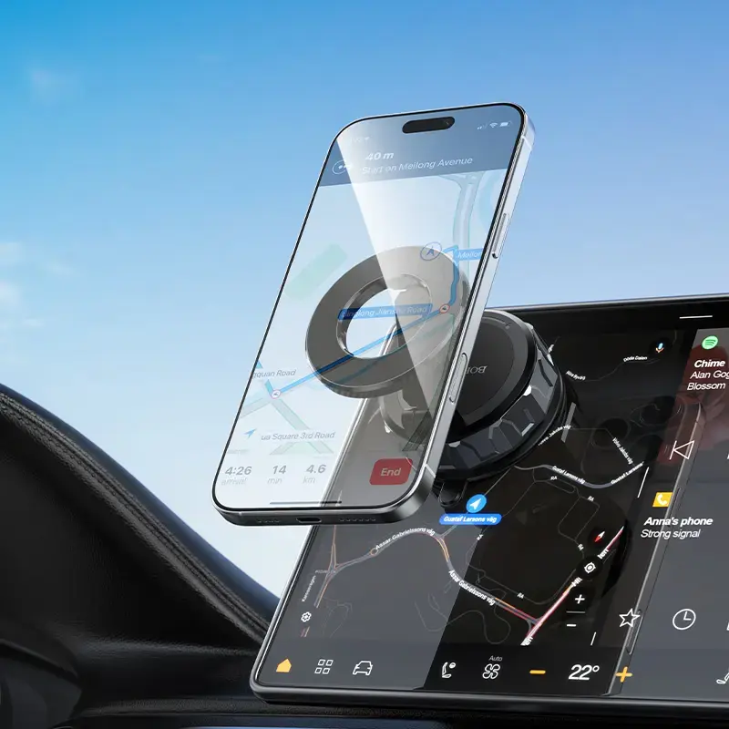 Made of ABS and nylon with a sun-drying pattern surface and oil spraying finish, it combines a modern look with durability. The magnetic head securely holds smartphones from 4.5 to 7 inches, mainly iPhone 12–17 series. It works great on windshields, rearview mirrors, displays, tiles, treadmills and other flat, smooth surfaces.