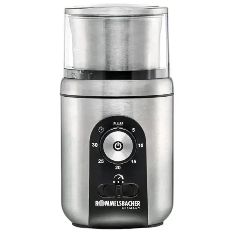 GEWÜRZ & KAFFEE MÜHLE EGK 250Diese besondere Gewürz & Kaffee Mühle von ROMMELSBACHER eignet sich perfekt zum Mahlen und Zerkleinern von Kaffeebohnen, Zucker, Gewürzen, Kräutern, Nüssen, Getreide sowie zur Zubereitung von Pesto, Rubs & Saucen. Die zwei unterschiedlichen Arbeitsbehälter aus hygienischem Edelstahl ermöglichen eine sehr variable Nutzung: Im Mahlbehälter stellt man frisch gemahlenes Kaffeepulver her und zermahlt im Nu trockene Gewürze wie Pfefferkörner, Koriander und Kümmel. Auch lassen sich darin Salz oder Zucker fein pulverisieren. Im Universalbehälter werden frische Kräuter zerkleinert und Pesto oder Rubs zum Grillen zubereitet. Für den perfekten Mahlvorgang lassen sich Zeit und Drehzahl in mehreren Stufen einstellen, und garantieren so ein stets gleichbleibendes Ergebnis. Ein manueller Betrieb ist über die Pulse-Funktion möglich. Die abnehmbaren Behälter sind aus robustem Edelstahl und sehr reinigungsfreundlich, da sie auch in die Spülmaschine dürfen. Die Gewürz & Kaffee Mühle EGK 250 ist ein unverzichtbarer Küchenhelfer, den auch anspruchsvolle Hobbyköche schnell ins Herz schließen.