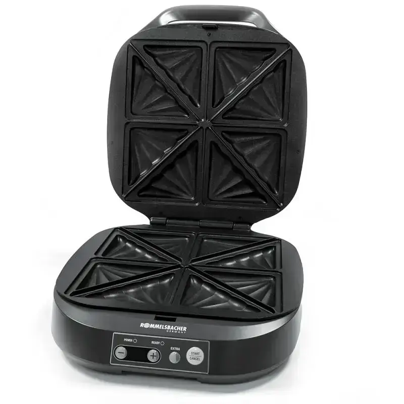 Der Sandwich Maker ST 1800 ist ein effektiver Küchenhelfer, der im Nu vier heiße Snackmahlzeiten zaubert. Er ist perfekt, um schnell und komfortabel große wie auch kleine Sandwich Liebhaber mit knusprig-saftigen Sandwich-Spezialitäten zu erfreuen. Die antihaftbeschichteten Backmulden bieten viel Fläche für 4 American XL Sandwiches. Das leistungsstarke Gerät heizt in Minutenschnelle auf und ist einfach über Soft-Touch Tasten zu bedienen, das LED Display bietet einen guten Überblick. Die Aludruckguss Toastplatten verteilen die Hitze optimal und sorgen für eine intensive Röstung in Muscheldesign auf den Toastscheiben. Eine Zeitschaltuhr erlaubt die Einstellung von individuellen Backzeiten und die Nachbräun-Funktion erlaub auf Tastendruck eine noch intensivere Röstung. Für Sicherheit im Gebrauch sorgen die automatische Abschaltung, das Cool-Touch Gehäuse, ein Überhitzungsschutz und die rutschfesten Gerätefüße. Die Antihaftbeschichtung ermöglicht zudem eine leichte Reinigung, anschließend kann der ST 1800 platzsparend senkrecht im Schrank verstaut werden. So snackt man heute!