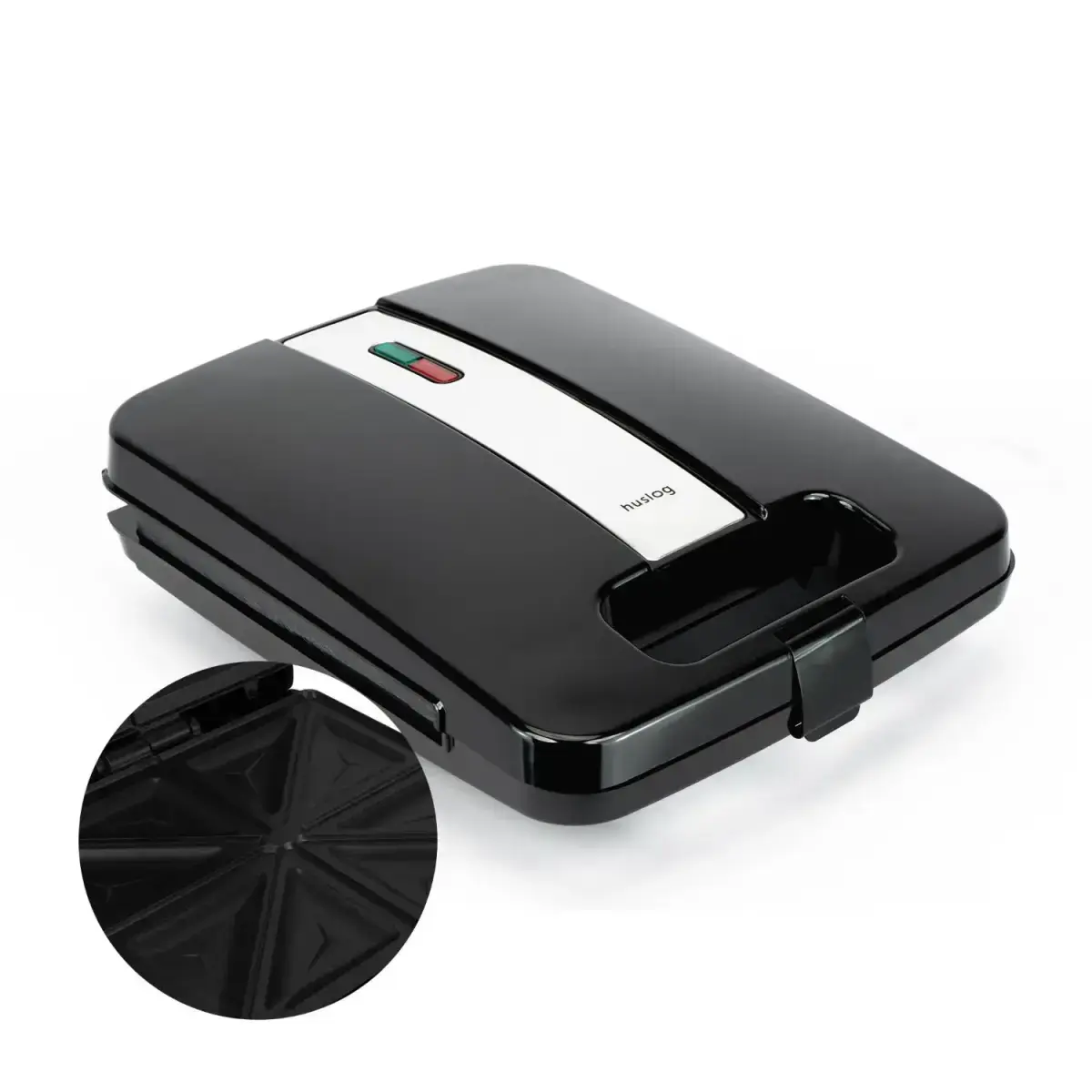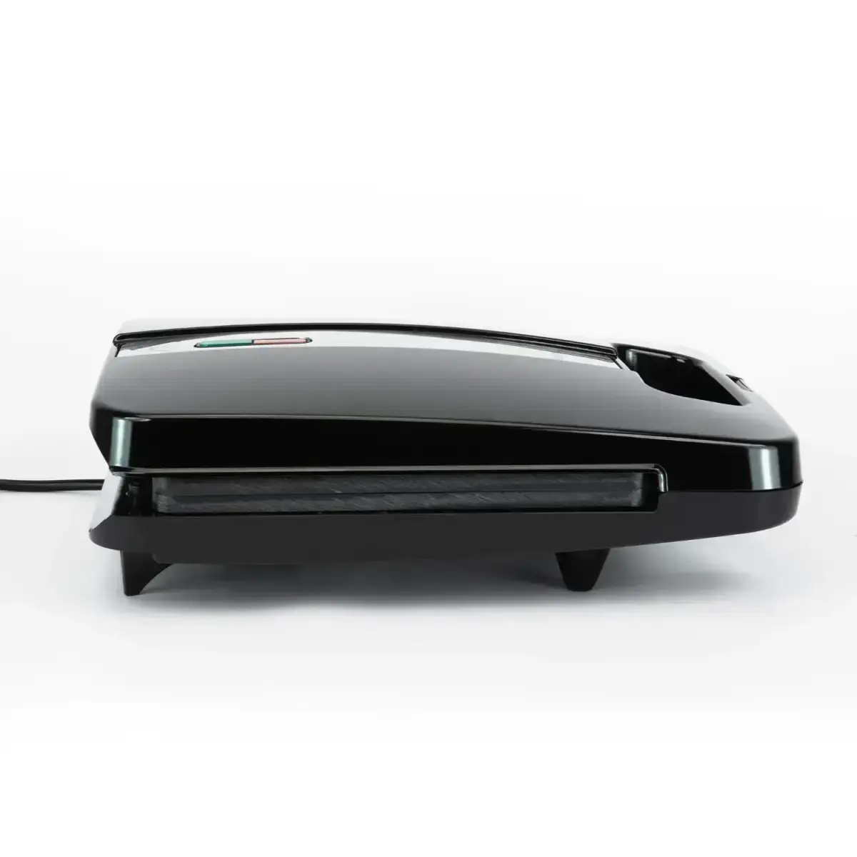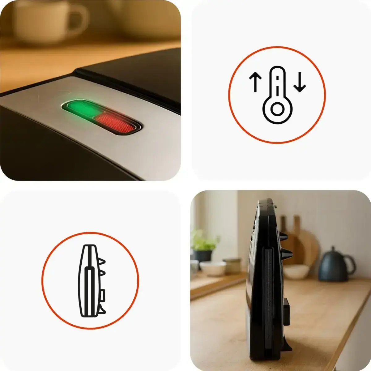 The grill heats up instantly thanks to its 1800 W power, ensuring even cooking. The non-stick plates make food preparation and quick cleaning easier. The cool handle, lock, and overheating protection enhance safety, while the anti-slip feet ensure stability. The device can be stored vertically, saving space in the kitchen. Included: MaxBite 1800 W grill and user manual.