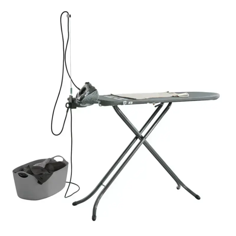 - Fiksēts gludekļa balsts ar kabeļa turētāju un kontaktligzdas turētāju nostiprina gludekli lietošanas laikā