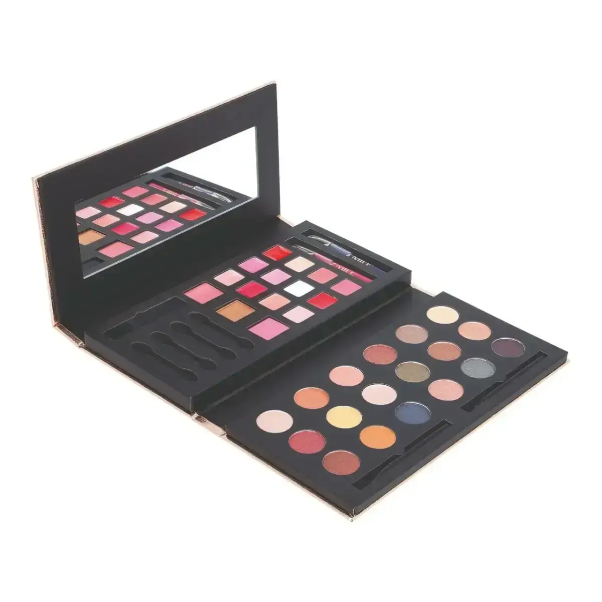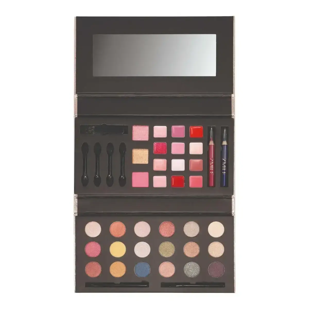 ZMILE COSMETICS Glam to Go, Cosmetic Sets for Women, Everything you need for perfect makeup in one place. The ZMILE COSMETICSGlam to Go beauty gift set contains not one but several beauty products that will help create or enrich your regular makeup routine. A gift set full of makeup products will delight you or your loved ones as a gift. The set contains: eyeshadow 18x0,88 g creamy lip gloss 12x0,43 g blusher 2x0,9 g bronzing powder 0,9 g eyeliner 0,7 g lip liner 0,7 g brush small 7 pc mirror 1 pc Characteristics: a treat for any woman perfectly brings out your eyes perfectly brings out your lips a complete routine for a perfect look for daytime and evening makeup allows you to vary your makeup Ingredients: vegan product.