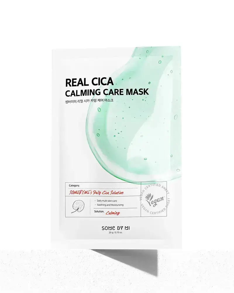 Infused with a powerful blend of cica ingredients, this mask soothes and heals your skin, the Centella asiatica extract, madecassoside, Asiatic acid, asiaticoside, and madecassic acid-enriched formula providing immediate relief. Specifically designed to target excess sebum production while shielding against the harmful effect of environmental stressors, this mask reinforces your skin's natural barrier, locking in moisture to keep it radiant, calm, and clear. Ideal for calming stressed, problematic, and irritated skin, this mask soothes and moisturises, adhering perfectly to the contours of your face without bubbles for a comfortable moment of self care. Benefits of SOME BY MI Real Cica Calming Care Sheet Mask 20g: Soothes and heals your skin. Targets excess sebum production to balance your skin. Strengthens your skin's natural barrier. How to use: After cleansing and toning, apply the mask evenly across your face, ensuring full coverage. Leave on for 10-20 minutes to allow the active ingredients to absorb. After removal, gently pat any remaining essence into your skin for maximum absorption. Size: 20g.