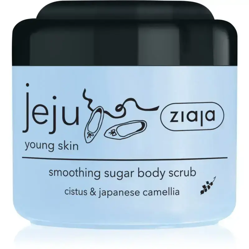Jeju Smoothing Sugar Body Scrub. Exfoliante corporal de azúcar, blanco, espeso, sin agua con pequeñas partículas negras.Su textura y fragancia atraen todos los sentidos durante su aplicación. Exfolia, suaviza y deja la piel con un delicioso aroma.El aceite de camelia japonesa hidrata y regenera la piel.El extracto de cistus es efectivo contra elacne en el cuidado facial.el extracto de cistus es efectivo en el cuidado facial contra el acné.El brahmi protege contra la irritación. La manteca de karité nutre la piel.
