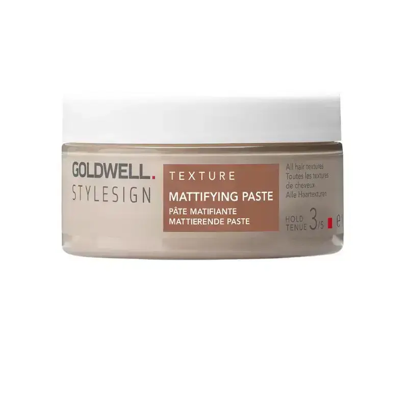 Goldwell StyleSign Mattifying Paste instantly creates matte, textured, and tousled styles with fullness. This paste provides medium hold with matte finish for all hair textures. Ingredients: Water/Aqua/Eau, Ricinus Communis (Castor) Seed Oil, Calcium Sulfate, Sorbitol, Bis- Diglyceryl Polyacyladipate-2, Hydrolyzed Corn Starch, Cetearyl Alcohol, Propanediol, Stearamidopropyl Dimethylamine, Hydroxyacetophenone, Lactic Acid, Hydrated Silica, Glycerin, Ethylhexylglycerin, Maltodextrin, Caprylic/Capric Triglyceride, Himanthalia Elongata Extract, Tocopherol, Phenoxyethanol, Fragrance/Parfum, Caramel | Goldwell Stylesign Mattifying Paste 100Ml In Clear.
