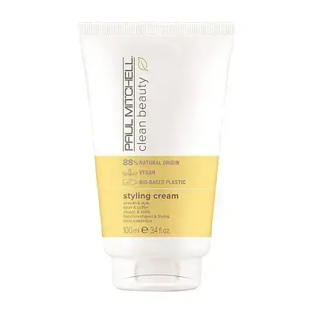 Paul Mitchell Clean Beauty Styling Cream is made with 88% natural origin ingredients, the versatile, multi-benefit styling cream softens, smooths and seals hair. Infused with flax seed and ferulic acid to strengthen and protect strands, the lightweight formula delivers memory and control with a clean, touchable feel. Handcrafted with sustainably sourced ingredients of 83% natural origin that deliver professional results in recyclable, bio-based packaging made from sugarcane for a smooth, frizz-free look you can feel good about. Enjoy a subtle apple scent with notes of lavender, lemon and honey, as these styling essentials help nourish, strengthen and protect hair against external stressors. Vegan. Ingredients: Aqua (Water, Eau), Cetearyl Alcohol, Cyclopentasiloxane, VP/DMAPA Acrylates Copolymer, Polyquaternium-37, Behentrimonium Methosulfate, Propylene Glycol, Dimethicone, Linum Usitatissimum (Linseed) Seed Extract, Hydrolyzed Vegetable Protein, Helianthus Annuus (Sunflower) Seed Extract, Ferulic Acid, Hydrolyzed Olive Fruit, Alcohol Denat., PPG-20 Methyl Glucose Ether, Caprylyl Glycol, Panthenol, Cetrimonium Chloride, Citric Acid, Glycerin, Disodium EDTA, Sodium Benzoate, Phenoxyethanol, Benzalkonium Chloride, Potassium Sorbate, Parfum (Fragrance), Benzyl Alcohol.