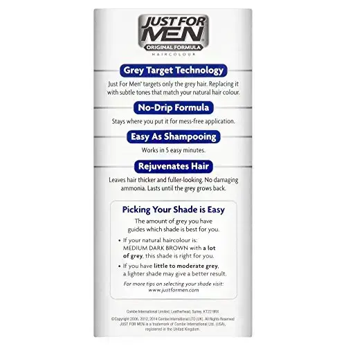 Just for Men targets only grey hair, Replacing it with subtle tones for a natural look. Just for Men works in only 5 minutes. And, it's as easy.