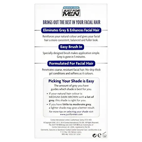 Just for Men brush-in gel penetrates coarse facial hair. Lasts until the grey grows back. Each shade matches the same Just for Men head haircolour. Plus, you get multiple applications from one box. | Just For Men Brush-In Facial Hair Colour Medium-Dark Brown In Clear.