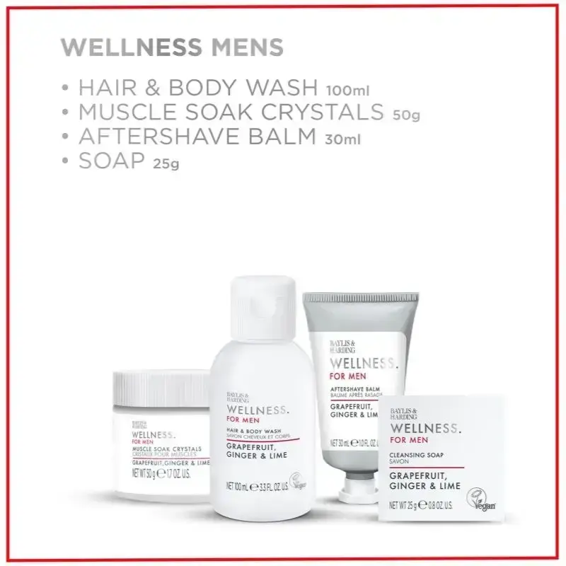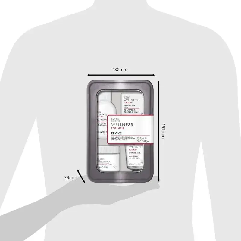 Baylis & Harding Wellness. For Men. Revive, Beauty gift sets for Men, Treat them to a cosmetic set Baylis & HardingWellness. For Men. Revive full of men’s body care products. It will make any modern man, who takes care of his appearance, happy. The set contains: cleansing gel for body and hair 100 ml bath salts 50 g aftershave balm 30 ml bar soap 25 g Characteristics: set of products for everyday use provides comprehensive care for men’s skin gives a feeling of freshness and energy after use leaves skin velvety soft and smooth makes a great gift pleasant fragrance a treat for any man How to use: Use every product from the cosmetic set according to the instructions.
