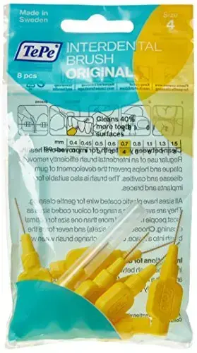 What is TePe Interdental Brushes Original Yellow TePe Interdental Brushes Original Yellow are designed specifically to clean in-between your teeth and all those hard to reach places. These special brushes are designed with a metal wire that cleans your teeth thoroughly. With daily use, these brushes can effectively reduce the build-up of plaque - thus preventing gum disease, bad breath and tooth decay. Usage How to use TePe Interdental Brushes Original Yellow Directions for the use of TePe Interdental Brushes Original Yellow: For the front of the mouth, insert the brush in the space between the teeth at the gum level by turning slightly. This technique aids access and reduces stress on the wire, thereby lengthening the life of the brush. Once inserted, gently move the brush back and forth a few times to remove plaque and debris. For the back of the mouth, access may be improved by first curving the brush head. Do Not bend. Never force the brush into a space. Always rinse the brush with water after use. Use daily, we recommend you change the brush every week, or when the bristles become worn.Usage Warnings Precautions to consider before using TePe Interdental Brushes Original Yellow You should carefully read all product packaging and labels prior to use.Warnings.