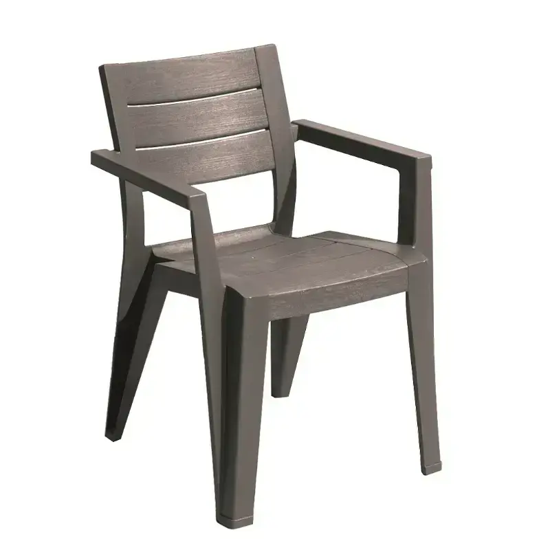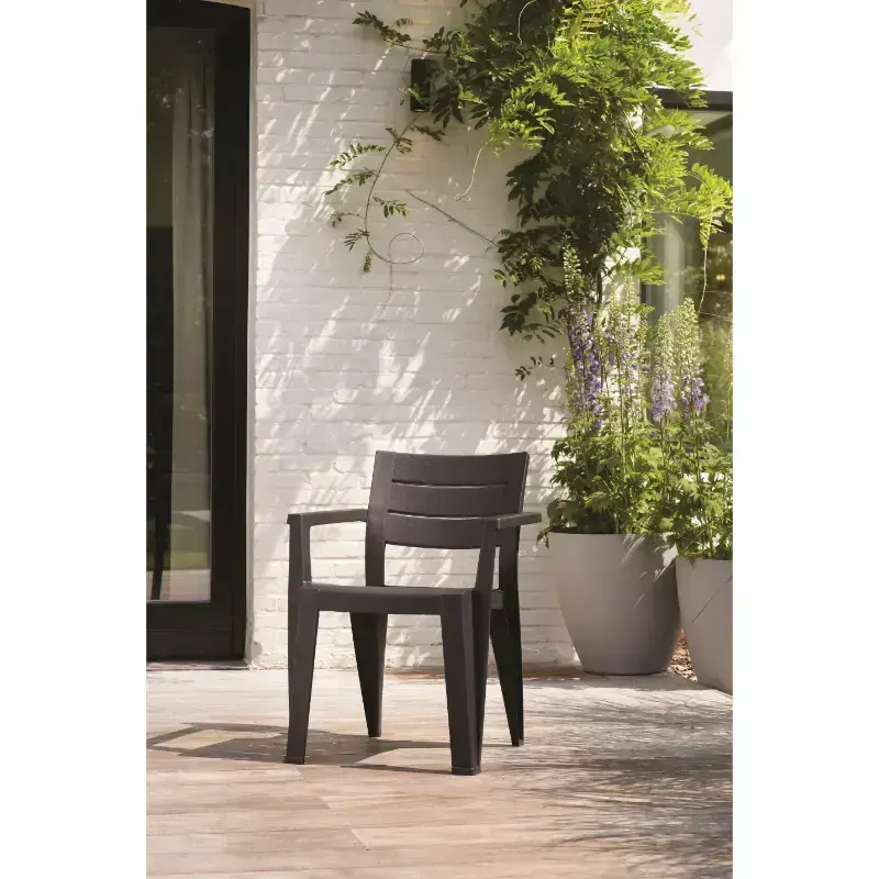 Dārza krēsla Julie mūsdienīgais dizains ir piemērots dažāda veida galdiem. Ērta Julie krēsla riekšrocība: sakraujami viens uz otra. Viegli tīrāmi, nav nepieciešama liela apkope. Ražoti no mūsdienīgas plastmasas, kas ir izturīga pret sliktiem laika apstākļiem.