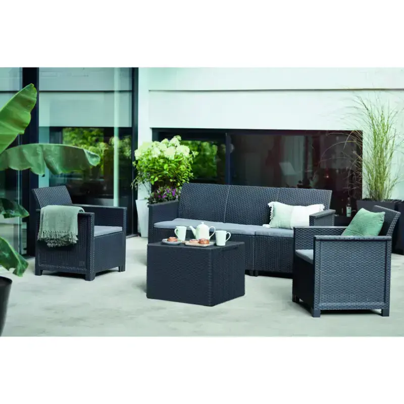 Sākotnējais dizains ļauj izvēlēties vienu no divām konfigurācijām. Visas nepieciešamās detaļas ir kastē ar 3-vietīgu dīvānu, diviem atzveltnes krēsliem un galdu, kas kalpos arī kā uzglabāšanas kaste.