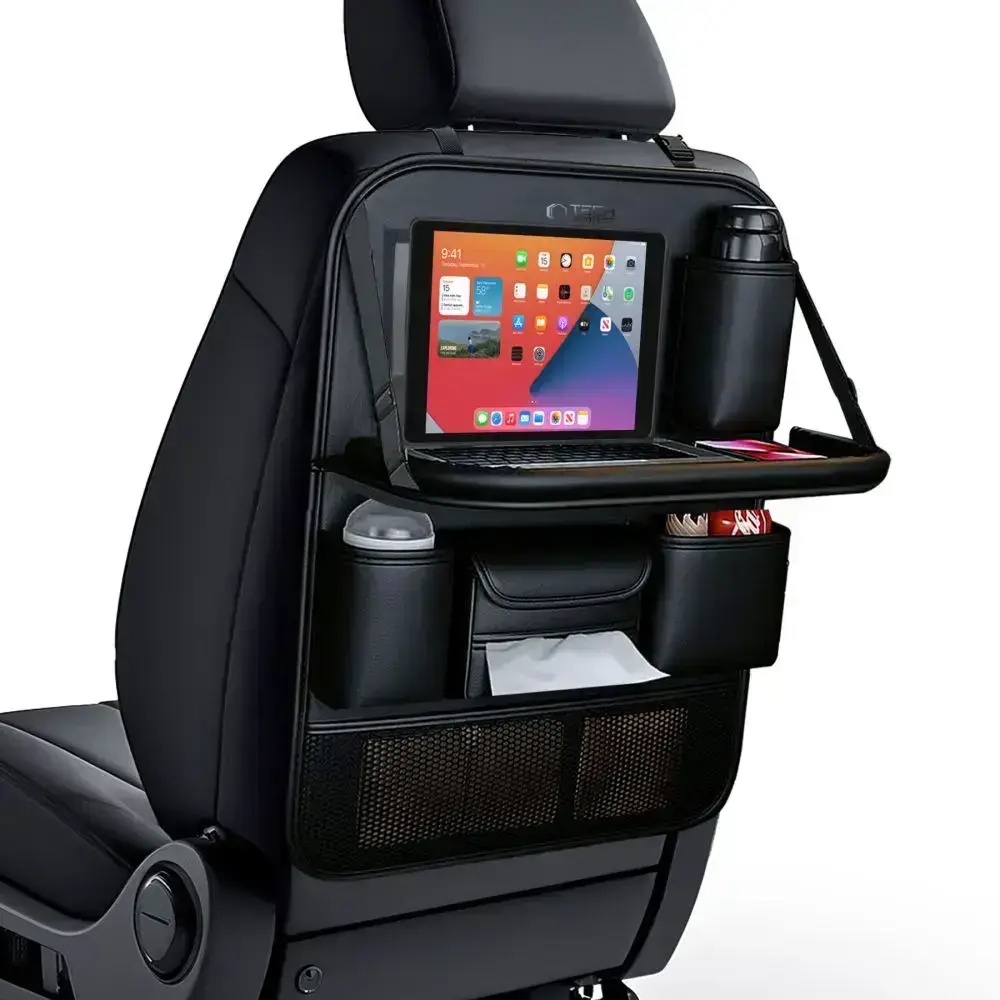 Organizer wyposażony jest w liczne kieszenie i przegródki o różnych rozmiarach, umożliwiające przechowywanie tabletu, telefonu, butelki z wodą, zabawek, dokumentów oraz innych drobnych przedmiotów. Centralnie umieszczony, rozkładany panel pozwala na bezpieczne korzystanie z niewielkiego laptopa lub tabletu wraz z klawiaturą podczas podróży, zapewniając rozrywkę pasażerom na tylnych siedzeniach.
