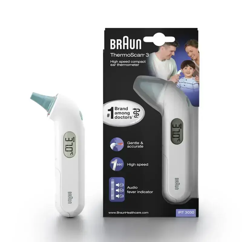 Kompaktes Infrarot-Ohrthermometer für die ganze Familie- Zuverlässig und einfach in der Anwendung- Von der von Ärzten am häufigsten empfohlenen Marke- Mit neuem Design und neuem akustischem FieberindikatorSchnell & Präzise- Präzise Temperaturmessung in nur 1 Sekunde- Mißt die vom Innenohr abgegebene Infrarot-Strahlung mit klinisch getesteter GenauigkeitNeu: Akustischer Fieberindikator- Einfache Interpretation des Messergebnisses: die Anzahl der Signaltöne zeigt an, ob die Temperatur normal (1x), erhöht (2x) oder hoch (Fieber) (4x) ist.Produktmerkmale für eine einfache und angenehme Anwendung- Kompaktes Design gewährleistet eine einfache Handhabung- Leicht lesbares LCD-Display- Messspitze geeignet für die Verwendung bei Neugeborenen- Speichert den letzten Temperaturmesswert- Automatische Abschaltung nach 60 Sekunden für eine längere Lebensdauer der Batterie- Temperaturmessung in Grad Celsius (34 - 42.2ºC) oder Grad Fahrenheit (93.2 – 108ºF)Hygienische Einweg-Schutzkappen- BPA- & latex-freie Einwegschutzkappen, Reinigung oder Desinfektion der Messspitze nicht erforderlich- Die Verwendung einer sauberen Einwegschutzkappe bei jeder Messung:1. Stellt eine hygienische, saubere Messung sicher2. Schützt vor gegenseitiger Ansteckung3. Stellt sicher, daß keine Schmutzpartikel oder Ohrenschmalz den Sensor und die Messgenauigkeit beeinträchtigenZubehör- Schutzkappe zur Aufbewahrung- 21x Einweg-Schutzkappen für eine hygienische Temperaturmessung- 1x Batterie. Batterieabdeckung mit Sicherheitsverschluß zum Schutz vor Kontakt mit der Batterie durch unbeabsichtigtes Öffnen, z.B. durch spielende Kinder (neu)Aufmerksamkeitsstarke Präsentation im Regal- Attraktive Verpackung mit qualitativ hochwertigem Design und Sichtfenster- Euroloch für flexible Platzierung stehend oder hängend