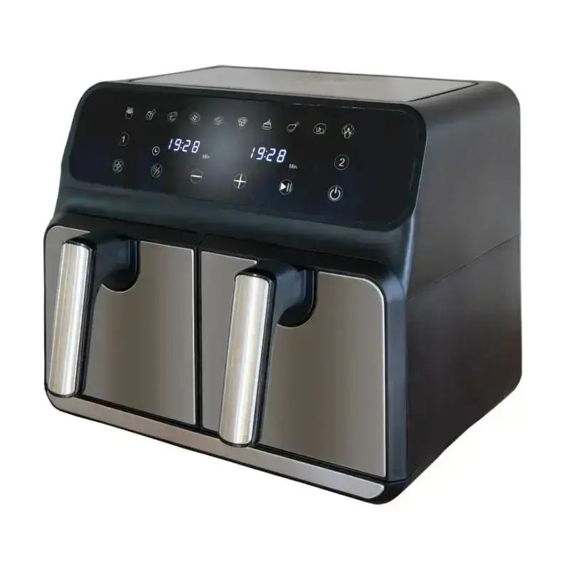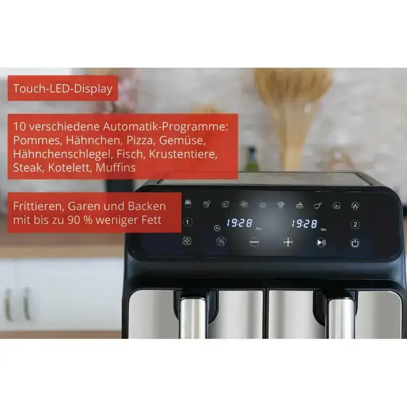 Frittieren, Grillen, Garen, Braten, Dörren, Backen, Warmhalten, Erhitzen, Auftauen und Rösten – und immer ölfrei: Die BPA-freie Heißluftfritteuse Twin Zone mit zwei Kammern macht’s möglich. Mit ihren 1.700 Watt Leistung und insgesamt 8 Liter Fassungsvermögen (jeweils 4 Liter pro Frittierkorb) können Sie bis zu 1 kg knusprige Pommes Frites zubereiten. Durch die Twin-Zone-Technologie ist sogar die Zubereitung zweier verschiedener Gerichte mit unabhängigen Garzonen möglich. Die Grillroste und Frittierkörbe sind entnehmbar, sodass eine einfache Reinigung, auch in der Spülmaschine, gewährleistet werden kann.Weitere Pluspunkte: 60-Minuten-Timer, Antirutschfüße, Abschaltautomatik und Sicherheitsabschaltung.