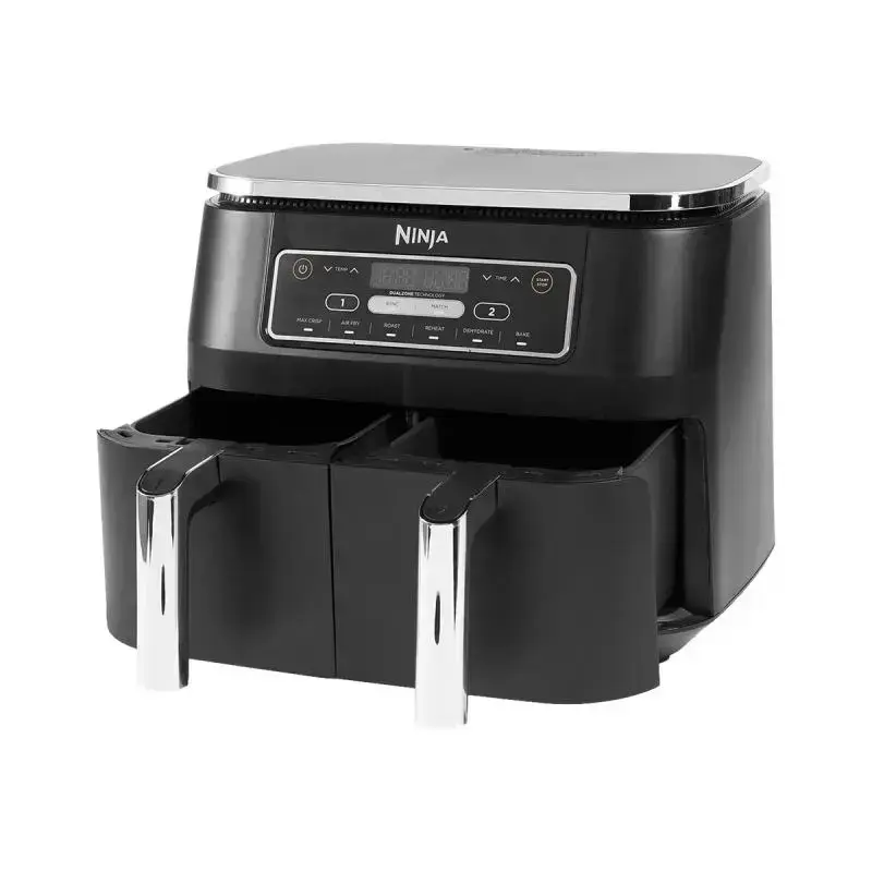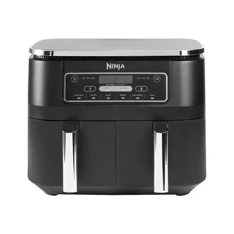 Die Heißluftfritteuse, mit der Sie gleichzeitig 2 unterschiedliche Mahlzeiten zubereiten!Mehr als eine Heißluftfritteuse – Die Ninja Foodi Dual Zone bietet gleich 6 Zubereitungsfunktionen in einem Gerät: Max Crisp, Braten, Backen, Aufwärmen, Dörren und Heißluft-Frittieren.Beim Kochen ist Timing alles. Die Ninja Foodi Dual Zone Heißluftfritteuse mit 7,6 l Fassungsvermögen bereitet Ihre Speisen gleichzeitig auf den Punkt zu. Dank 2 unabhängiger Garzonen können Sie Programme, Garzeiten und Temperaturen in beiden Fächern individuell einstellen. Mit der SYNC-Funktion stimmen Sie die unterschiedlichen Zubereitungszeiten miteinander ab und können alles zur gleichen Zeit servieren. Sie kochen für die ganze Familie? Mit der MATCH-Funktion können Sie problemlos die doppelte Menge zubereiten.Bis zu 75 % schneller als ein Umluftherd*. Genießen Sie frittierte Gerichte mit gutem Gewissen mit bis zu 75 % weniger Fett**.*Getestet mit Fischstäbchen und Würstchen, einschließlich Vorheizen.**Getestet mit herkömmlich frittierten, handgeschnittenen Pommes.