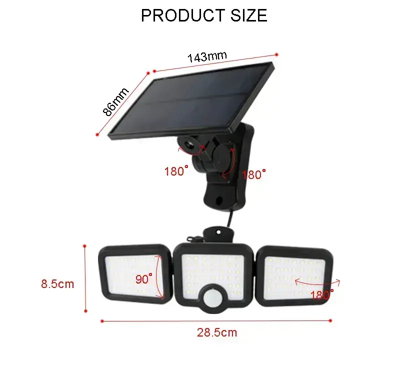 In addition, the lamp consists of three separate lamps that can be directed in different directions, allowing you to illuminate a larger space. The solar panel is a separate module, connected to the lamp by a 5-meter cable, which allows you to place the lamp in a dark place and the panel in a sunnier one.